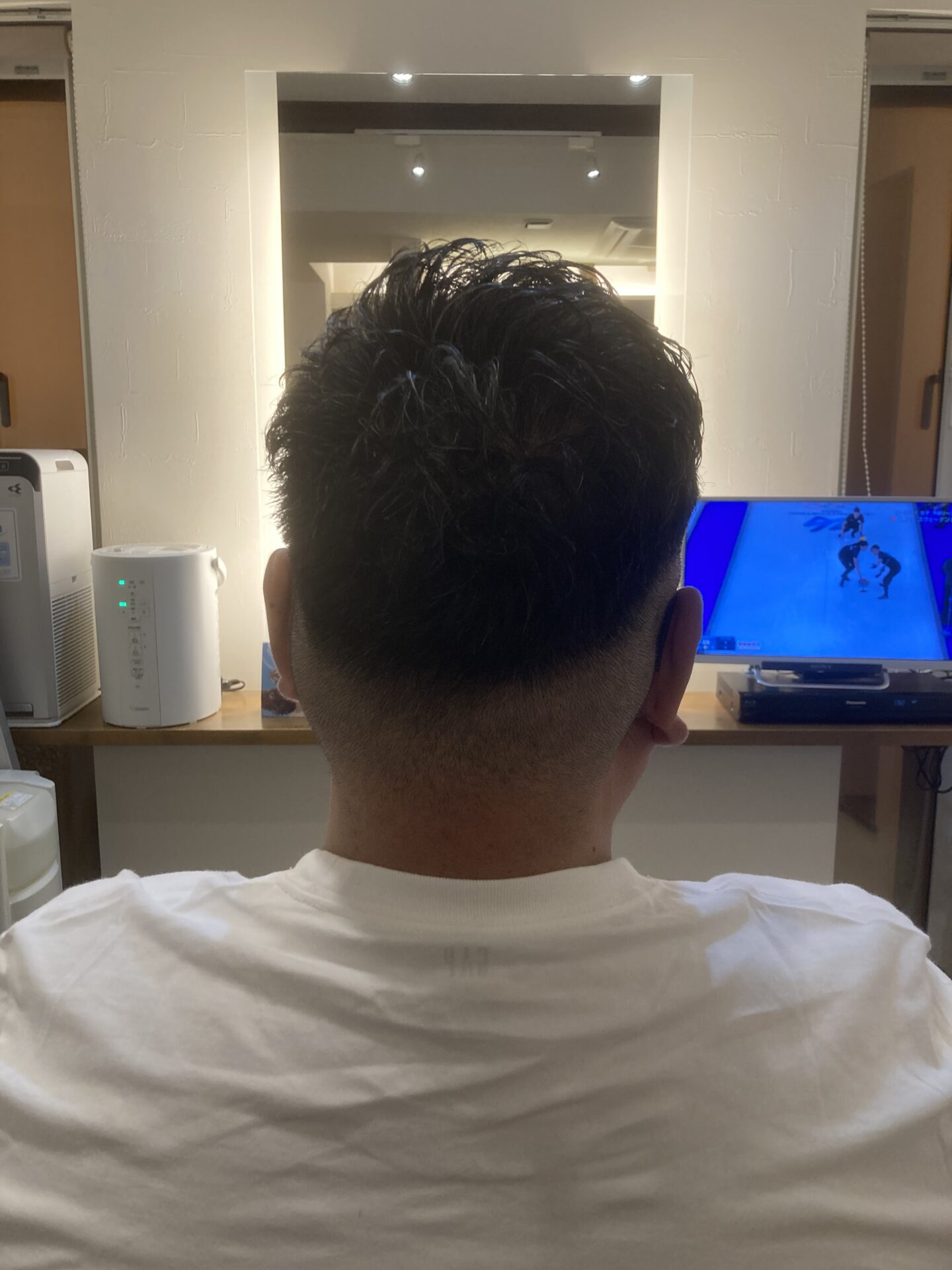 オーダー ⬜︎ カット………サイドバック3㎜バリカンフェード フロント3cmに設定 アイロンセットでパーマ風な仕上がりに …